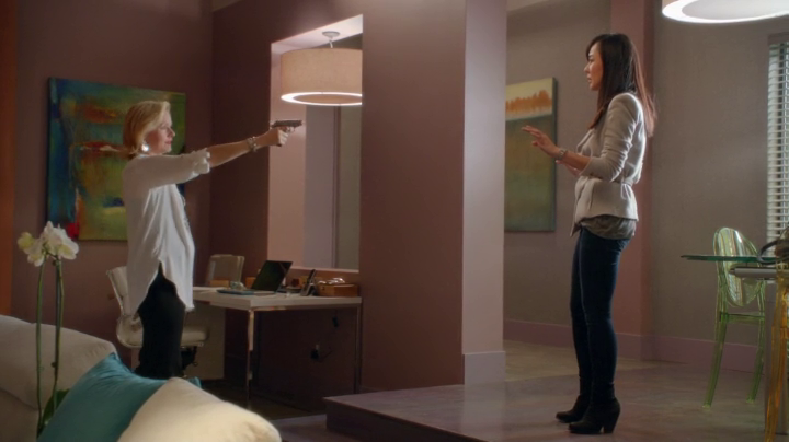 Karen does not only find out that Elizabeth used to be a patient of a mental clinic, but she also gets to experience how crazy she is because she is trying to kill her. Sam comes to the rescue, but we don’t know what happens, all we hear is a shot, and see blood splatter on her white couch. I wonder if those stains ever get out.